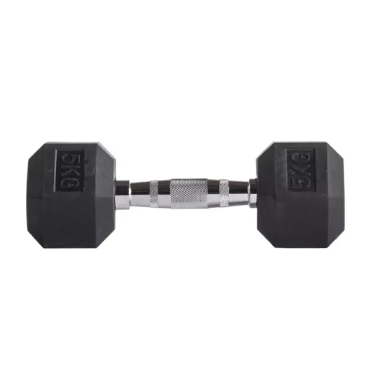 Mancuerna Hexagonal 5 kg profesional para gimnasios y hogar. fabricada en alta calidad y recubierta en ule que facilita su agarre y aumenta su durabilidad mientras evita el riesgo de accidentes o daños en el piso.