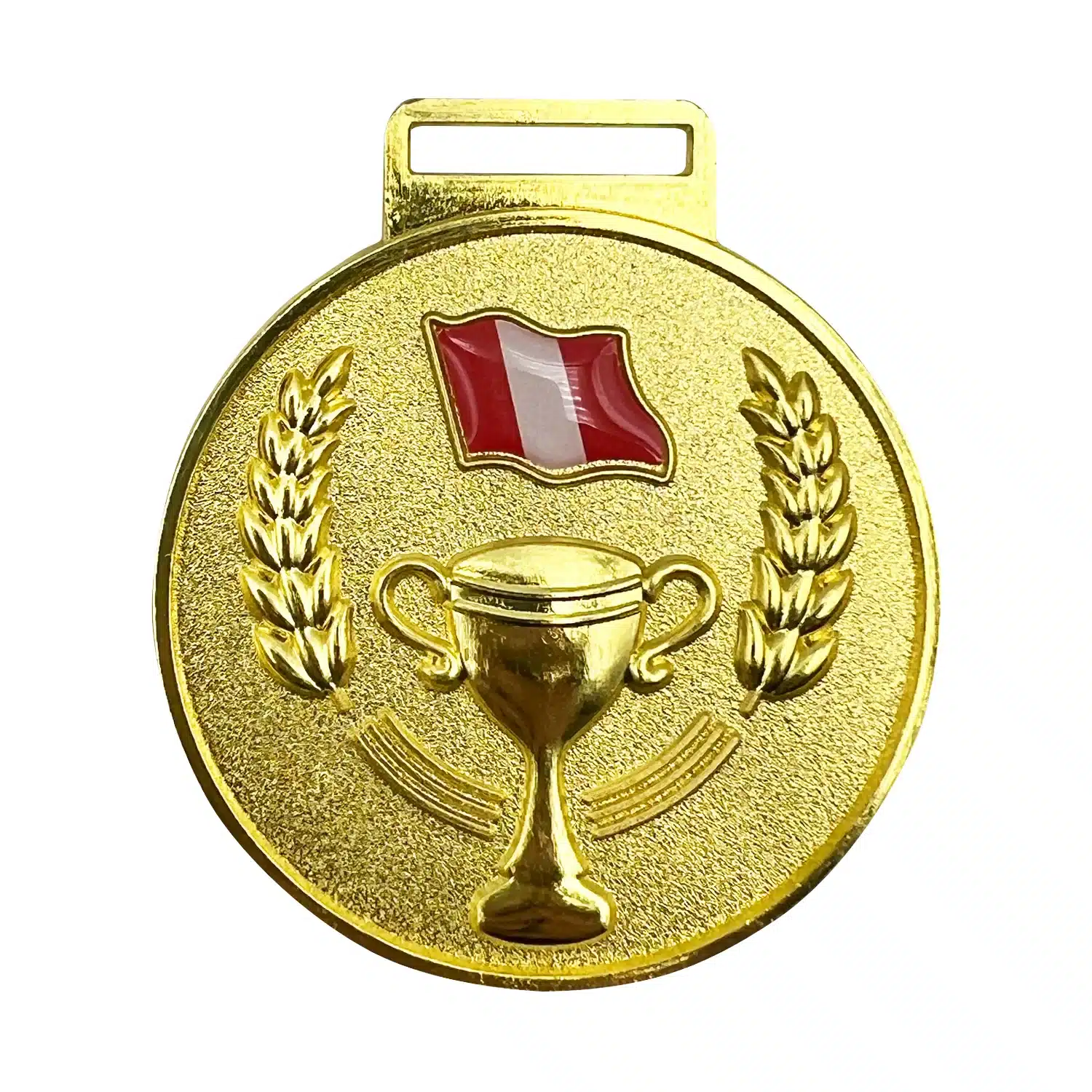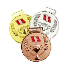 La Medalla para Premiación Perú 5 cm representa el orgullo nacional y la victoria deportiva. Esta medalla metalizada destaca por su diseño en 3D con relieve, que incorpora una pequeña bandera de Perú y una elegante copa, simbolizando el esfuerzo y el triunfo en cada competencia.