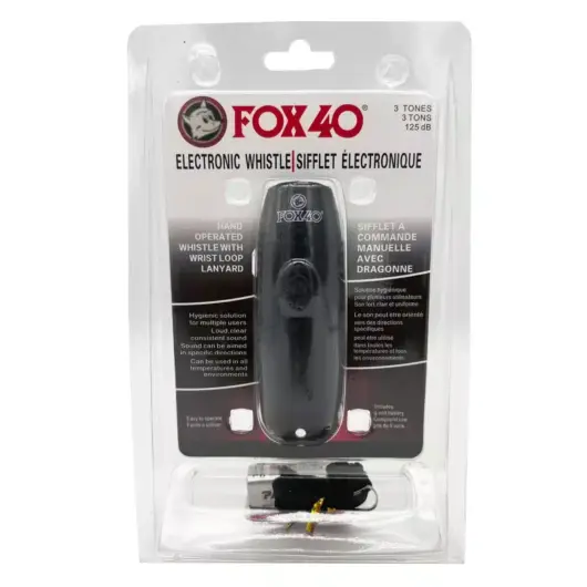- El silbato electrónico Fox 40 tiene un botón que proporciona un sonido fuerte, claro y consistente